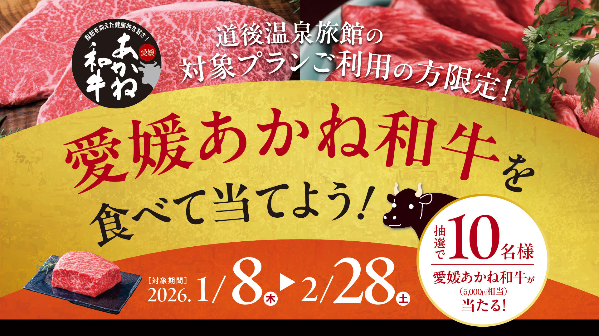 期間中、道後温泉旅館の対象プランを利用した方を対象にあかね和牛が当たるキャンペーンを実施します。