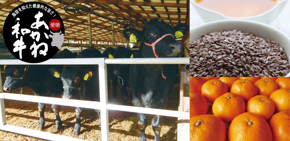 愛媛生まれで愛媛育ち。 アマニ油と愛媛特産の かんきつを与えることで、 健康的で食べやすい肉に。