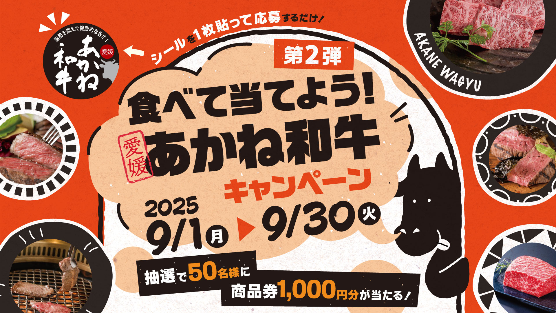 期間中、愛媛県内の精肉店であかね和牛を購入し、応募台紙に「あかね和牛」のシールを応募台紙に貼って応募すると商品券が当たるキャンペーンです。