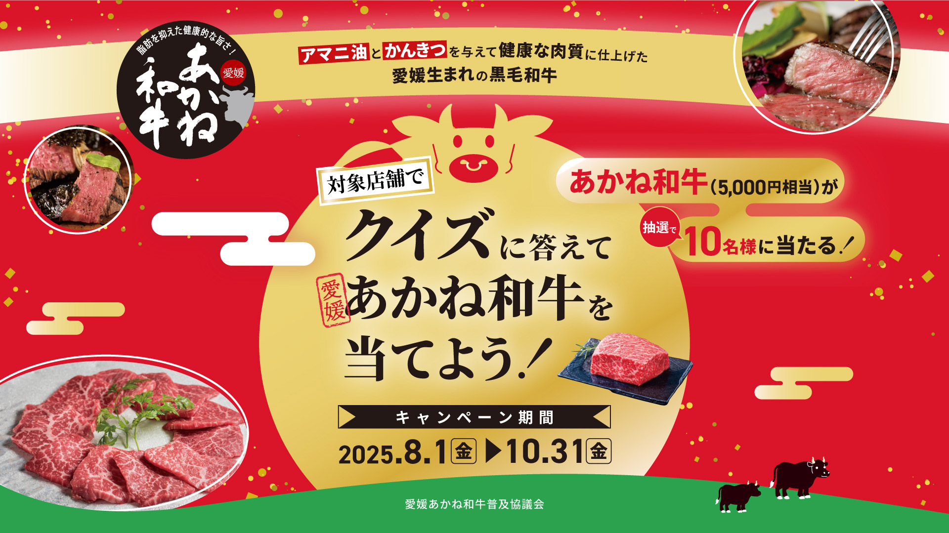 期間中、愛媛県内の対象店舗で、クイズに答えてあかね和牛を当てよう!ぜひ対象店舗へ足を運んでキャンペーンに応募しよう!